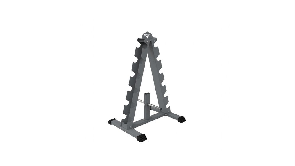 A-Frame racks feature a triangular frame with two or three tiers. Each tier holds dumbbells in a sloped cradle or tray. The angle prevents dumbbells from rolling off or sliding forward. Most racks use steel for strength and durability. Rubber feet or pads protect floors from scratches. Their vertical design saves floor space compared to flat racks.
